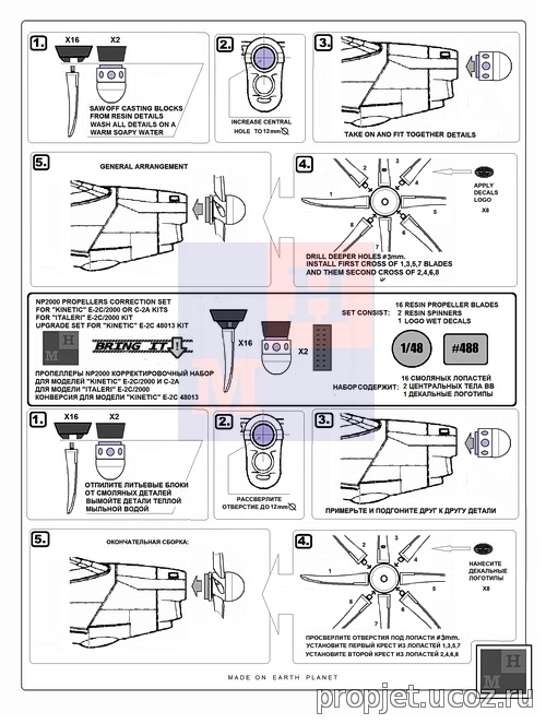 Идея набора: Кинетиковская модель(и) красива на литниках, но есть на солнце пятна и есть неточности в винтомоторной группе. Центральное тело пропеллера короче, прикинь Карлуха, на 4мм. И деталировка у лопастей так себе. Центральное тело мы создали свое, нормальной длины, в одну деталь. Со всякой видимой мелочевкой из расшивки и элементами крепления. Дистанционного колечка как на С-130 у него нет. Лопасти такие же, как в геркулесовском наборе. Со всеми деайсерами ПОС и видимым "никелевым" носком. С такой "взрослой", серьёзной круткой. Используя набор можно улучшить внешний вид моделей Е-2С2000 48014/16/66 & 2687 и C-2A2000 48025 либо проапгрейдить кинетиковский набор 48013.